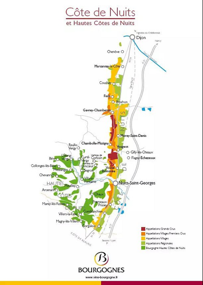 除了最北面的只生產(chǎn)白葡萄酒的產(chǎn)區(qū)夏布利(Chablis),勃艮第核心產(chǎn)區(qū)在金丘區(qū)(Côte d’Or),其中北部為尼伊丘(Côte de Nuit),主要產(chǎn)紅葡萄酒,產(chǎn)少量白葡萄酒;南部為博納丘(Côte de Beaune),主要產(chǎn)白葡萄酒,少量紅葡萄酒。