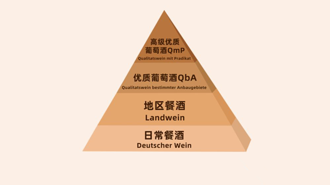 德國(guó)作為歐盟成員國(guó)之一,出產(chǎn)的葡萄酒也遵循這一法規(guī)。德國(guó)的葡萄酒從低至高主要分為四個(gè)等級(jí):日常餐酒(Deutscher Wein)、地區(qū)餐酒(Landwein)、優(yōu)質(zhì)葡萄酒(Qualitatswein bestimmter Anbaugebiete,簡(jiǎn)稱QbA)和高級(jí)優(yōu)質(zhì)葡萄酒(Qualitatswein mit Pradikat,簡(jiǎn)稱QmP)。