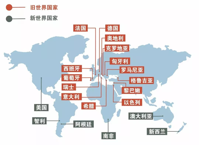 舊世界葡萄酒指代在葡萄酒發(fā)源地生產(chǎn)的葡萄酒,比如歐洲和中東地區(qū)的國家:法國、西班牙、意大利奧地利、希臘、黎巴嫩、以色列、克羅地亞、格魯吉亞、羅馬尼亞、匈牙利和瑞士等。