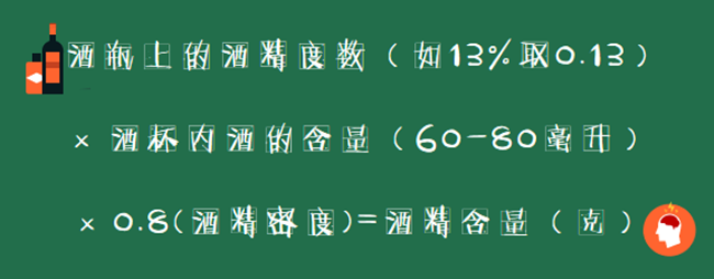 大家常飲用的葡萄酒度數(shù)一般為11 - 13%,按照不超過酒杯1/3的倒酒標(biāo)準(zhǔn),一杯葡萄酒通常有60 - 80毫升。按下圖計算公式,喝一杯葡萄酒,你將攝入5 - 8克酒精。