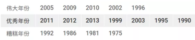勃艮第雖然擁有許多超級名莊(如羅曼尼·康帝、亨利·賈伊等),但是在上世紀(jì)7、80年代,勃艮第的好年份乏善可陳。進(jìn)入21世紀(jì)之后,勃艮第的年份普遍評價較高,除了天氣條件較好之外,釀酒師的努力有目共睹。