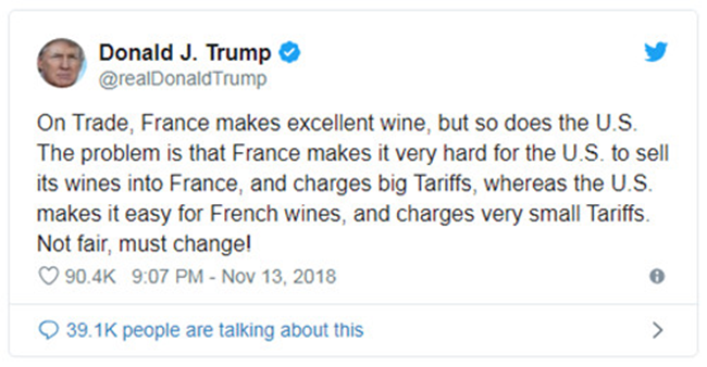 其實(shí),川普盯上法國(guó)葡萄酒也不是頭一回了,之前就在推特上發(fā)文炮轟,痛斥法國(guó)在葡萄酒貿(mào)易上“霸道”,說(shuō)的也是關(guān)稅的事。