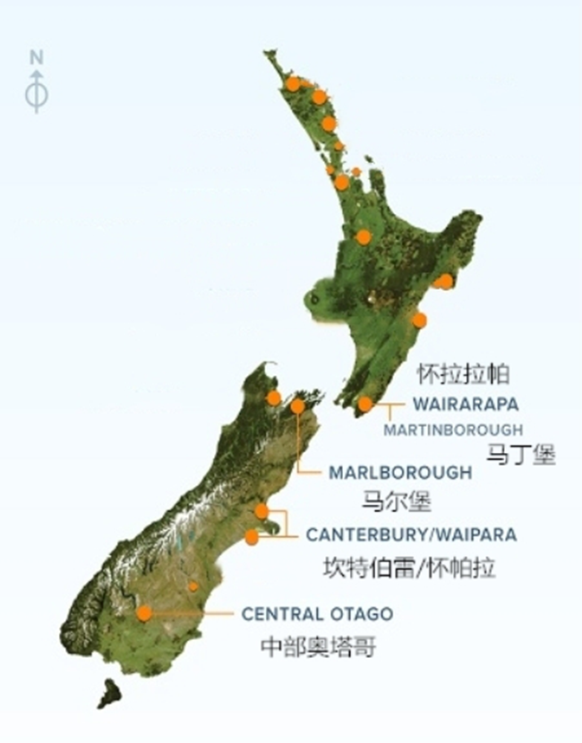 黑皮諾占新西蘭紅葡萄品種總種植量的72%,它也是該國種植面積第二大的品種,僅次于長相思(Sauvignon Blanc)。由于黑皮諾更適合在較涼爽的氣候下生長,因而主要分布在北島南端以及南島幾大產(chǎn)區(qū)。各產(chǎn)區(qū)的土壤和氣候等自然條件豐富多樣,釀出的黑皮諾葡萄酒也具有繽紛多彩的風(fēng)格。