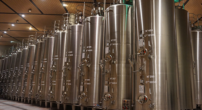 葡萄經(jīng)過去梗和破碎之后,便會轉(zhuǎn)移至發(fā)酵罐中。發(fā)酵容器可以是不銹鋼罐、水泥罐或是橡木桶,且一般容量較大,頂部為敞口設(shè)計,便于釀酒師在發(fā)酵過程中對酒帽進(jìn)行控制。酒帽指的是發(fā)酵過程中浮在酒液表面上的一層厚厚的果肉與果皮,如果不對酒帽進(jìn)行控制,任由其自然發(fā)展,那么下層酒液與它的接觸就會比較有限,不利于充分萃取顏色、香味物質(zhì)和單寧,因此發(fā)酵過程中,控制酒帽極為重要。