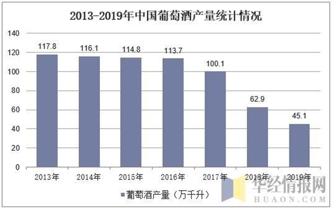 然而,目前中國的葡萄酒產(chǎn)業(yè)發(fā)展并不成熟,隨著我國國民生活質(zhì)量的提高,對高端葡萄酒需求增加,進口葡萄酒快速蠶食國產(chǎn)葡萄酒市場份額,近年來中國葡萄酒產(chǎn)量持續(xù)下降,2019年中國葡萄酒產(chǎn)量達45.1萬千升,與2018年相比減少了17.8萬千升。