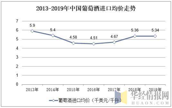 從進口均價來看,近年來我國葡萄酒進口均價基本維持在5千美元/千升,2015年葡萄酒進口均價下降至5千美元/千升以下,2016年以后葡萄酒進口價格又逐漸開始回升,據(jù)海關統(tǒng)計數(shù)據(jù)顯示,2019年國內(nèi)葡萄酒進口均價為5.34千美元/千升,與2018年基本持平。