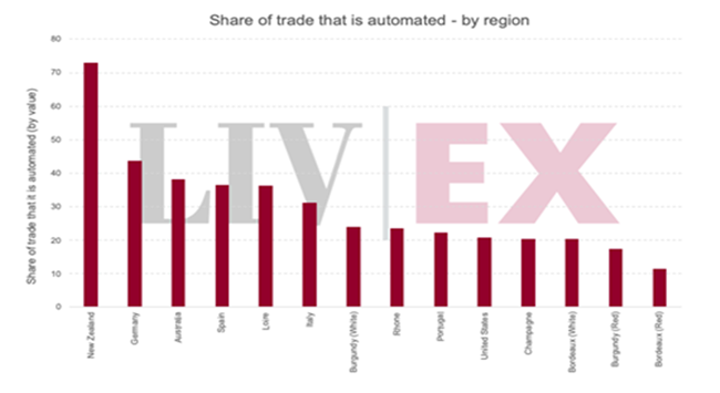 我們發(fā)現(xiàn),在Liv-ex上非傳統(tǒng)強勢市場的酒區(qū),它們會有更多葡萄酒通過自動化來進行交易。 如新西蘭:該酒區(qū)有超過70%的葡萄酒交易都涉及自動化。