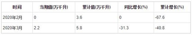 2020年3月全國葡萄酒產量為2.2萬千升,累計值為5.8萬千升,同比下降31.3%,累計下降40.8%。