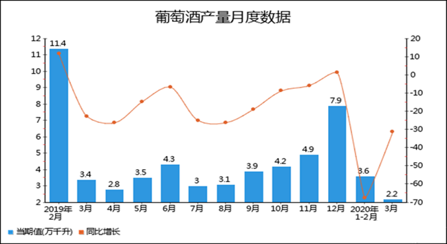 根據(jù)中國報告大廳對2020年1-3月全國葡萄酒產量進行監(jiān)測統(tǒng)計顯示:2020年3月全國葡萄酒產量2.2萬千升,同比下降31.3%,2020年1-3月全國葡萄酒產量為5.8萬千升,累計下降40.8%。