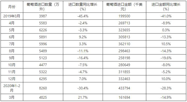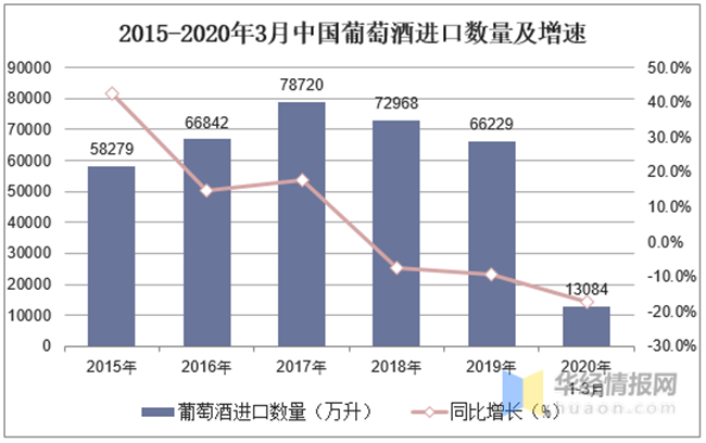 2015-2020年3月中國葡萄酒進口數(shù)量及增速