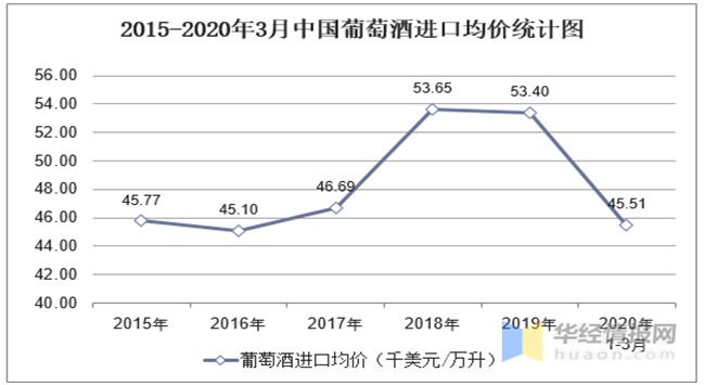 華經(jīng)產(chǎn)業(yè)研究院數(shù)據(jù)顯示:2020年1-3月中國葡萄酒進口數(shù)量為13084萬升,相比上年同期減少了2778.2萬升,降幅為17.4%;進口金額為595419千美元,相比上年同期減少了208930千美元,降幅為25.1%;2020年1-3月中國葡萄酒進口均價為45.51千美元/萬升。