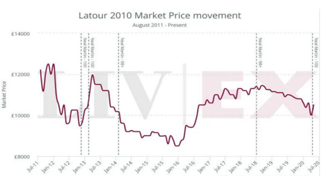 有跌有升,在接下來(lái)的幾年,此酒的價(jià)格開(kāi)始隨大市走強(qiáng)而上升。然而,在2018年再次被確認(rèn)98+分后,價(jià)格又再次波動(dòng)。如今,此酒比其2011年時(shí)的前倫敦發(fā)行價(jià)(11,000英鎊 每箱12×75)折價(jià)5%。