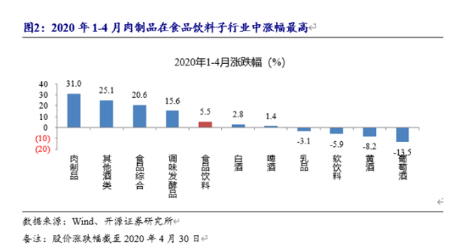2020年1-4月食品飲料板塊上漲5.5%,在一級子行業(yè)中排名第三。漲幅分解來看,預計2020年凈利增長15%。