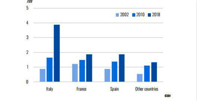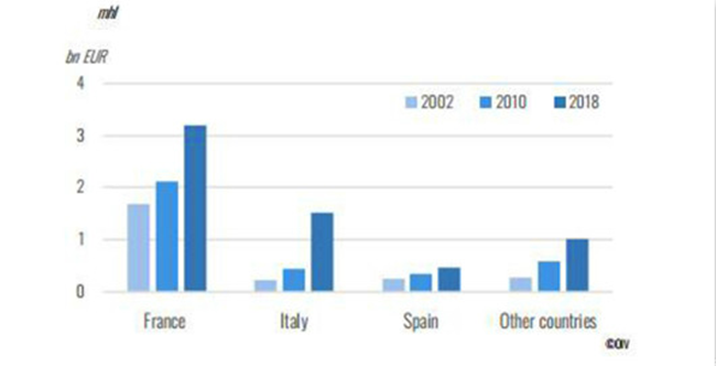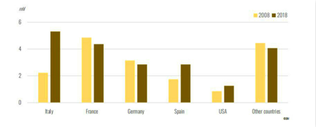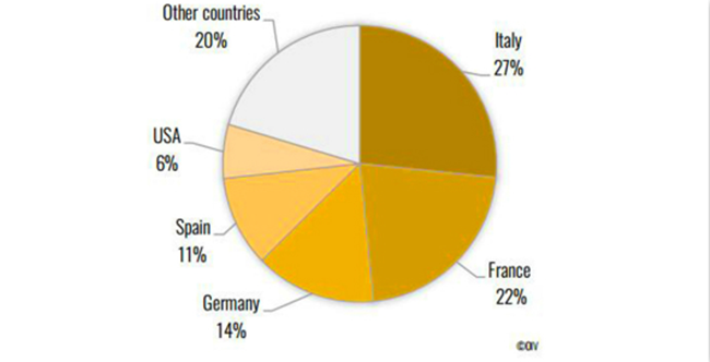 2018年,意大利起泡酒的出口量為3.9億升,占全球起泡酒出口市場(chǎng)的43%。主要出口市場(chǎng)為英國(guó)、美國(guó)、德國(guó)。出口值為15億歐元。
