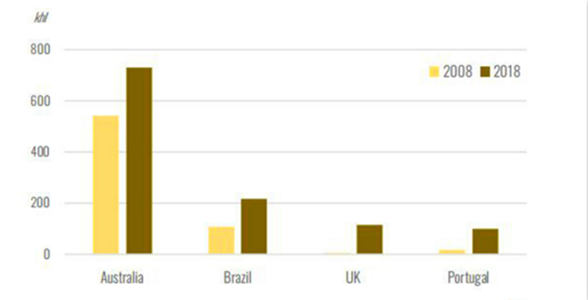 近年來(lái),全球涌現(xiàn)出了很多新興起泡酒生產(chǎn)國(guó),諸如英國(guó)(平均年度增長(zhǎng)率33%)、葡萄牙(平均年度增長(zhǎng)率18%)、巴西(平均年度增長(zhǎng)率7%)、澳大利亞(平均年度增長(zhǎng)率3%)。其中,英國(guó)的起泡酒產(chǎn)量占本國(guó)葡萄酒總產(chǎn)量的70%以上。
