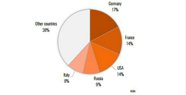 2018年,全球前六大起泡酒消費(fèi)國(guó)分別為:德國(guó)(3.2億升)、法國(guó)(2.6億升)、美國(guó)(2.6億升)、俄羅斯(1.6億升)、意大利(1.6億升)、英國(guó)(1.5億升)。德國(guó)、法國(guó)、美國(guó)、俄羅斯、意大利,這五個(gè)國(guó)家占全球起泡葡萄酒消費(fèi)的62%。