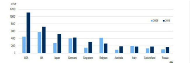 按價(jià)值計(jì)算,美國(guó)是最大的進(jìn)口國(guó)(11.12億歐元),其次是英國(guó)(7.23億歐元),日本(5.23億歐元),德國(guó)(4.25億歐元),新加坡(3.08億歐元)。自2008年,美國(guó)、日本市場(chǎng)有了顯著增長(zhǎng),年平均增長(zhǎng)率分別為9%和7%。