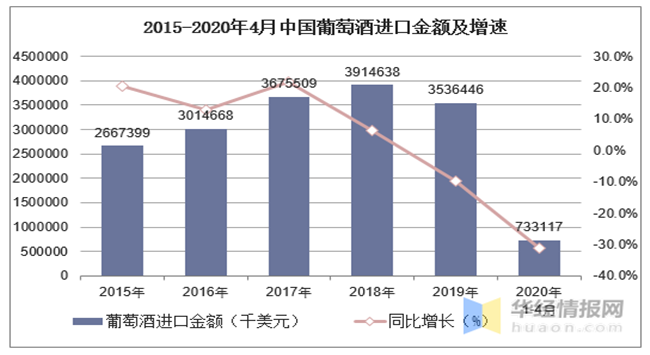 2015-2020年4月中國葡萄酒進口數(shù)量及增速