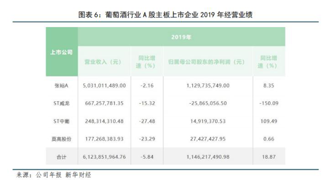 2019年四家葡萄酒企實(shí)現(xiàn)總營收61.24億元,同比降低5.84%;實(shí)現(xiàn)歸屬于母公司凈利潤11.46億元,同比增加18.87%。其中,張?jiān)I收達(dá)50.31億元,雖然稍低于年初制定的力爭實(shí)現(xiàn)營業(yè)收入不低于53億元的目標(biāo),但其龍頭地位毋庸置疑,經(jīng)營業(yè)績遙遙領(lǐng)先。并且,張?jiān)?019年?duì)I收占全國葡萄酒行業(yè)規(guī)模以上企業(yè)銷售收入的34.68%;2019年實(shí)現(xiàn)歸母凈利11.30億元,超過了全國葡萄酒行業(yè)規(guī)模以上企業(yè)利潤總額(10.58億元)。