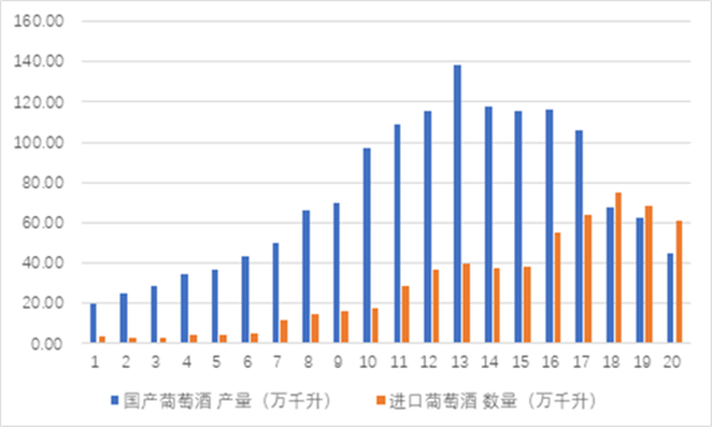 假如時光倒流20年,葡萄酒在中國也是稀罕物,是高端人士過上時尚生活的標志,雖然規(guī)模有限只有23.65萬千升,但國產(chǎn)葡萄酒有20.19萬千升,而進口葡萄酒只有3.46萬千升。20年后的今天,中國葡萄酒的市場規(guī)模達到92.1萬千升,國產(chǎn)葡萄酒產(chǎn)量為45.1萬千升,而進口葡萄酒的已經(jīng)達到61.25萬千升。專業(yè)人士稱,這已經(jīng)是進口葡萄酒連續(xù)三年超過國產(chǎn)葡萄酒了。