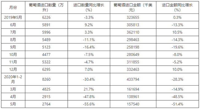 2015-2020年5月中國葡萄酒進口數(shù)量及增速