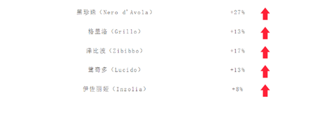 相較2018年,各葡萄品種增長(zhǎng)如下,由此可以看出,黑珍珠(Nero d'Avola)、格里洛(Grillo)等代表的本土品種大放異彩,已經(jīng)成為西西里葡萄酒的嶄新名片。