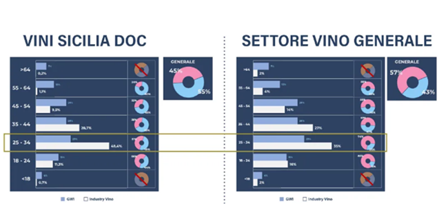 從參與西西里葡萄酒互動(dòng)的用戶畫像上看,西西里法定產(chǎn)區(qū)葡萄酒的消費(fèi)者要年輕很多,區(qū)間甚至低于整個(gè)葡萄酒消費(fèi)的平均年齡段:25-34歲的人群非常集中。總體來說,消費(fèi)者偏 "男性化",但在18-34歲的年輕群體中,女性消費(fèi)者則更為突出。