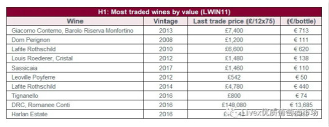 Giacomo Conterno, Barolo Riserva Monfortino 2013年成為上半年交易總值最高的葡萄酒。目前為止,意大利的交易份額為10.3%,而此酒則占了該酒區(qū)14.6%交易。2013年份(去年年底發(fā)布)取得Antonio Galloni (Vinous) 99分。2014年份(AG 100)于本月初上市。目前的出價(jià)為£8,400(760歐元 / 每瓶)。