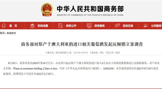 8月18日,商務(wù)部發(fā)布公告稱,決定即日起對(duì)原產(chǎn)于澳大利亞的進(jìn)口裝入2升及以下容器的葡萄酒進(jìn)行反傾銷調(diào)查。