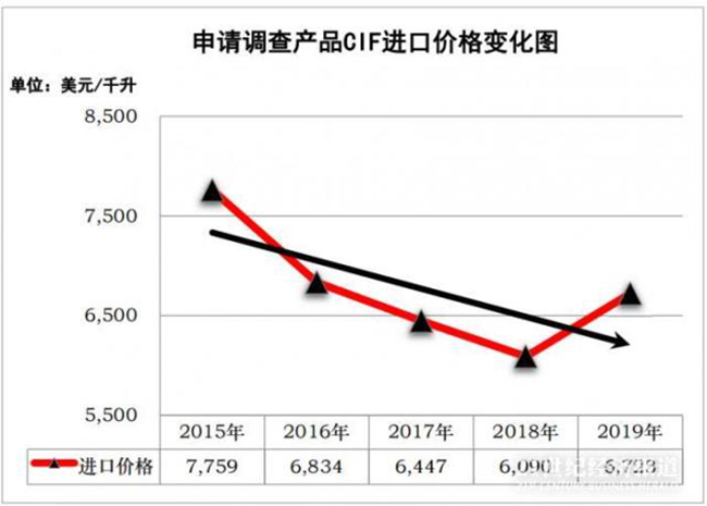 申請(qǐng)調(diào)查期內(nèi),澳大利亞該類葡萄酒的進(jìn)口價(jià)格總體呈下降趨勢(shì)。2015年至2019年,澳大利亞該類葡萄酒的進(jìn)口價(jià)格分別為7,759美元/千升、6,834美元/千升、6,447美元/千升、6,090美元/千升和6,723美元/千升,2016年比2015年下降11.92%,2017年比2016年下降5.67%,2018年比2017年下降5.54%,2018年比2015年大幅下降21.51%,2019年比2018年上漲10.39%,但仍比2015年累計(jì)下降13.36%。