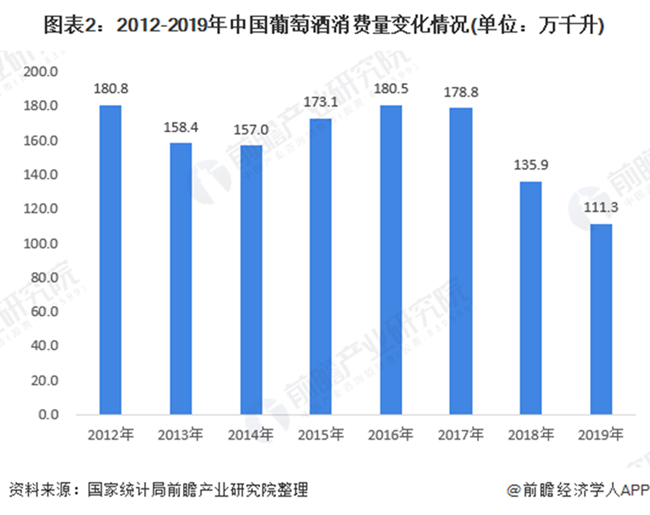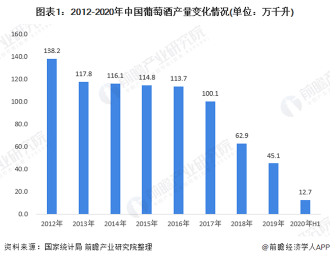國(guó)家統(tǒng)計(jì)局?jǐn)?shù)據(jù)披露,2012-2019年,我國(guó)葡萄酒產(chǎn)量逐年下降。2019年,我國(guó)葡萄酒產(chǎn)量為4.51億升,較2018年下滑28.30%。2020年上半年,我國(guó)葡萄酒產(chǎn)量繼續(xù)走低,僅為1.27億升。