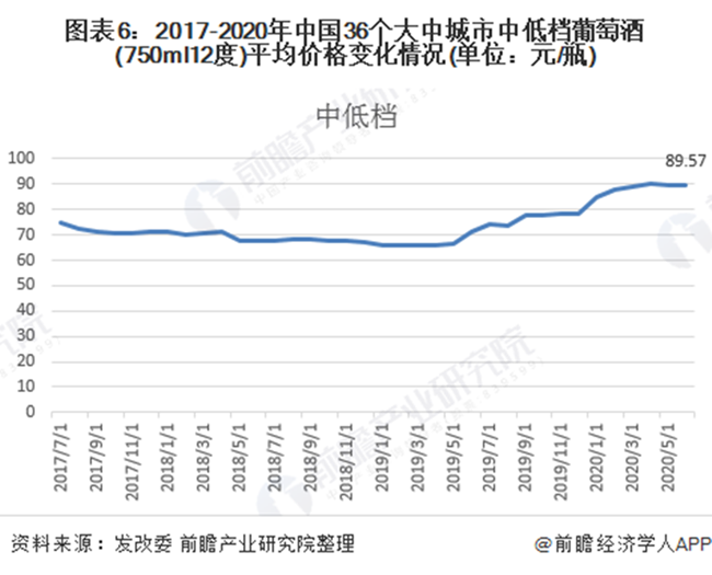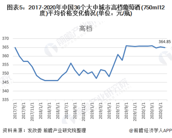 根據(jù)發(fā)改委披露的2017-2020年中國(guó)36個(gè)大中城市日用工業(yè)消費(fèi)品平均價(jià)格來看,2017-2020年我國(guó)葡萄酒價(jià)格整體上呈現(xiàn)先下降后增長(zhǎng)的態(tài)勢(shì)。其中高檔葡萄酒價(jià)格波動(dòng)幅度略高于中低檔葡萄酒。截至2020年6月,我國(guó)高檔葡萄酒平均價(jià)格為364.85元/瓶,中低檔葡萄酒平均價(jià)格為89.75元/瓶。