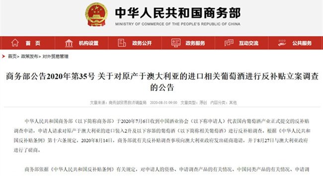 根據(jù)上述審查結(jié)果,依據(jù)《中華人民共和國反補貼條例》第十六條的規(guī)定,商務(wù)部決定自2020年8月31日起對原產(chǎn)于澳大利亞的進口相關(guān)葡萄酒進行反補貼立案調(diào)查?,F(xiàn)將有關(guān)事項公告如下: