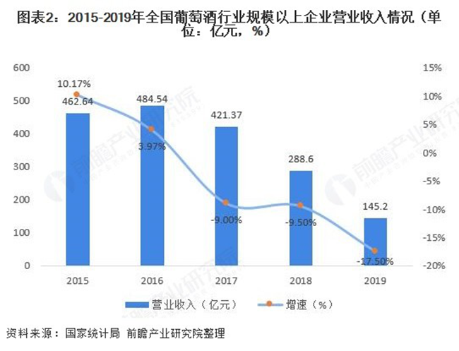 在營業(yè)收入與利潤總額方面,全國葡萄酒行業(yè)規(guī)模以上企業(yè)已經(jīng)連續(xù)三年“雙降”。2019年全國葡萄酒行業(yè)規(guī)模以上企業(yè)實現(xiàn)營業(yè)收入145.2億元,同比下滑17.5%;實現(xiàn)利潤總額10.6億元,同比下滑16.7%。