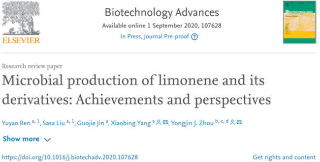 近日,葡萄酒學院楊曉兵副教授團隊在著名生物技術(shù)學術(shù)期刊《Biotechnology Advances》(IF=10.744)發(fā)表了題為 “Microbial production of limonene and its derivatives: Achievements and perspectives” 的綜述文章,系統(tǒng)總結(jié)了近年來利用代謝工程和合成生物學策略合成檸檬烯及其衍生物研究進展。西北農(nóng)林科技大學為第一署名單位,中科院大連化學物理研究所為合作單位;16級本科生任毓瑤和18級博士研究生劉灑灑為共同第一作者,我校楊曉兵副教授與大連化物所周雍進研究員為共同通訊作者,我校靳國杰副教授參與了該綜述的撰寫工作。《Biotechnology Advances》是生物技術(shù)領(lǐng)域頂級國際期刊,在105種應(yīng)用微生物與生物技術(shù)相關(guān)的雜志中排名第3,該雜志全年收錄文章在100篇左右,2019年H指數(shù)161。