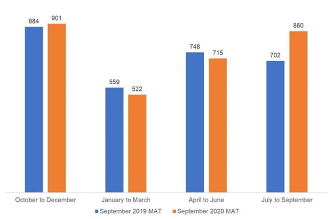 在截至2020年9月的12個月中,出口額的增長主要受到了英國和中國大陸的良好出口表現(xiàn)的推動。尤其在這12個月中的最后一個季度,這種漲勢尤為強勁。