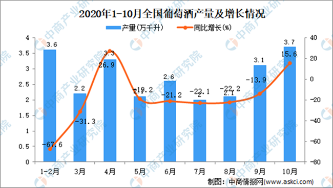 據(jù)中商產(chǎn)業(yè)研究院數(shù)據(jù)庫顯示,2020年10月全國葡萄酒產(chǎn)量增長,2020年10月全國葡萄酒產(chǎn)量為3.7萬千升,同比增長15.6%。2020年1-10月全國葡萄酒產(chǎn)量為32萬千升,同比增長4.6%。