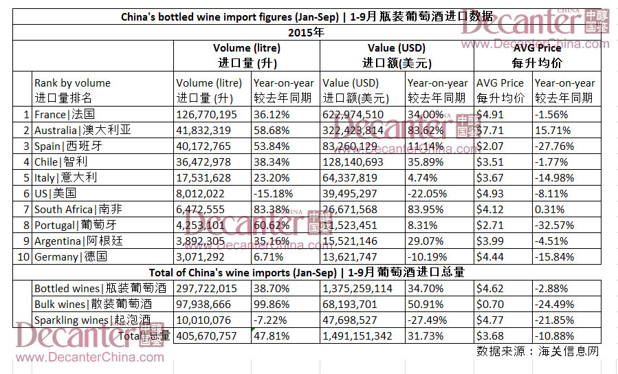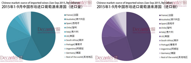 根據(jù)海關(guān)發(fā)布的數(shù)據(jù)顯示,今年一月到九月,中國市場瓶裝葡萄酒進口量同比上升38.7%,達3.0億升,進口額上升34.7%,達14億美元。其中,法國和澳大利亞葡萄酒進口增長顯著。這表示,中國進口葡萄酒市場在2015年前三季度強勢回暖。