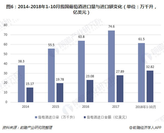 由下圖可見,隨著關(guān)稅降低,2014-2017年以來國內(nèi)葡萄酒進口量和進口金額逐年穩(wěn)步增長。2018年前10月,葡萄酒進口依舊活躍,進口量達61.5萬千升,進口額實現(xiàn)32.82億美元,與國內(nèi)疲軟的產(chǎn)量數(shù)據(jù)形成對比,反映出我國對葡萄酒的需求仍然較強,且進口葡萄酒的市場占有力已經(jīng)遠超國產(chǎn)酒。