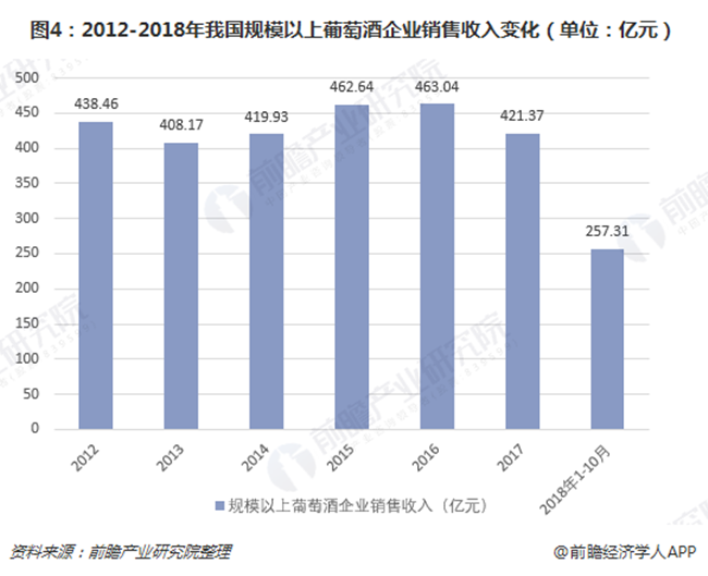 2018年前10月,我國規(guī)模以上葡萄酒企業(yè)銷售額為257.31億元,較上年同期下滑6.79%。進入2018年,進口葡萄酒大量涌入加上進口葡萄酒產(chǎn)品價格區(qū)間進一步下移,導(dǎo)致國內(nèi)葡萄酒市場尤其是中低價位葡萄酒市場競爭十分激烈。
