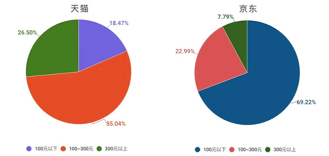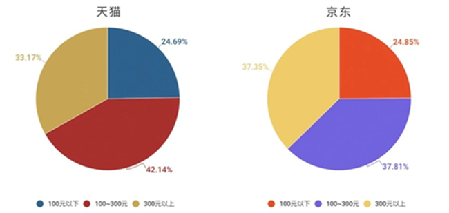 在天貓和京東兩大電商平臺(tái)上,智利葡萄酒的酒款數(shù)量占比均為8.4%,非常一致;此外,兩大平臺(tái)不同價(jià)位的智利葡萄酒分布也相對(duì)接近──低端智利酒的占比略低,而中高端的酒款數(shù)量比起意大利等競爭對(duì)手來說則明顯占比更高。