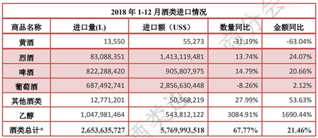 2018 年 1-12 月,進口酒類市場整體繼續(xù)上行,量額齊升,增幅擴大,這主要得益于烈酒、啤酒以及其他酒類的增長,三者量額均保持兩位數增長,葡萄酒量額漲跌互現,黃酒量額齊跌。