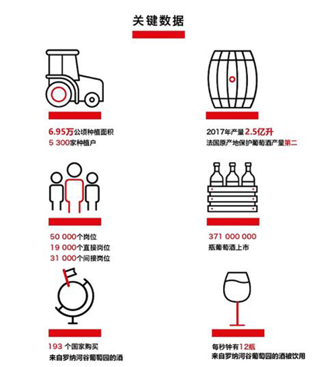 羅納河谷葡萄酒產(chǎn)區(qū)擁有6.95萬公頃種植面積,5300家種植戶。2017年份葡萄酒總產(chǎn)量達(dá)2.5億升,產(chǎn)量在法國(guó)AOC產(chǎn)區(qū)中排名第二,羅納河谷葡萄園的酒出口到193個(gè)國(guó)家,每秒鐘有12瓶來自羅納河谷葡萄園的酒被飲用。