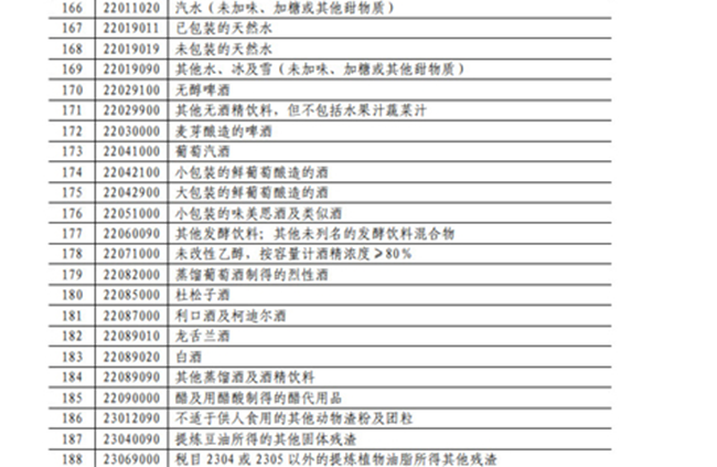 葡萄酒位于《對(duì)美實(shí)施加征25%關(guān)稅商品清單》中,“葡萄汽酒”、“小包裝的鮮葡萄釀造的酒”、“大包裝的鮮葡萄釀造的酒”、“小包裝的味美思酒及類(lèi)似酒”4個(gè)類(lèi)目均在列。此外,各種烈性酒、啤酒的類(lèi)目也在這份清單中。