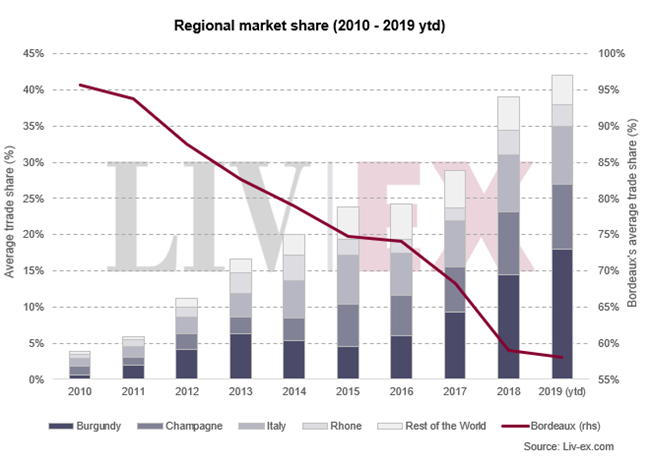 在2018年度報告中,我們發(fā)現(xiàn)優(yōu)質(zhì)葡萄酒市場不斷擴大,買家對更多不同酒區(qū)的葡萄酒的興趣不斷增加。2019年至今,除了這多元化的趨勢繼續(xù)保持,勃艮第的交易份額也創(chuàng)新高。