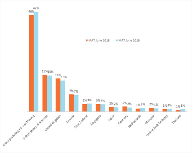 澳大利亞葡萄酒在中國表現(xiàn)非常良好?;仡?019年的前5個(gè)月,澳大利亞在進(jìn)口額上成為中國大陸排名第一的葡萄酒進(jìn)口來源國。同時(shí),在全球葡萄酒進(jìn)口市場總量下挫22%的情況下,澳大利亞葡萄酒在中國大陸的表現(xiàn)依然強(qiáng)勢,其市場份額相比于2015年增長了13%,達(dá)到了進(jìn)口總量的24%。澳大利亞鞏固了其作為中國市場優(yōu)質(zhì)葡萄酒主要供應(yīng)商的顯赫地位。