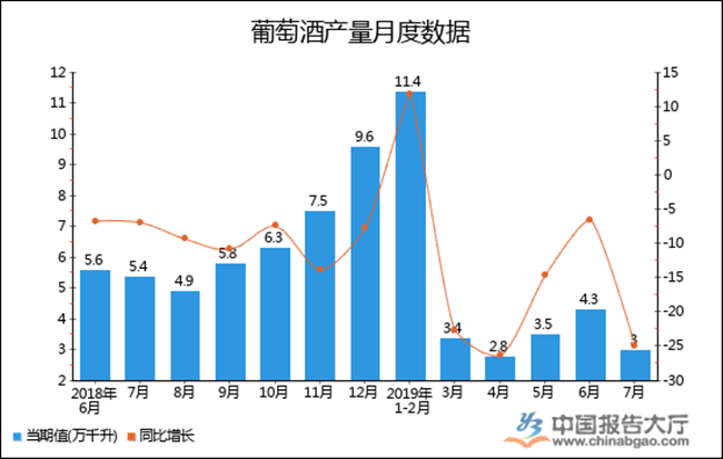 根據中國報告大廳對2019年1-7月全國葡萄酒產量進行監(jiān)測統計顯示:2019年7月全國葡萄酒產量3萬千升,同比下降25%,2019年1-7月全國葡萄酒產量為23.7萬千升,累計下降23.1%。