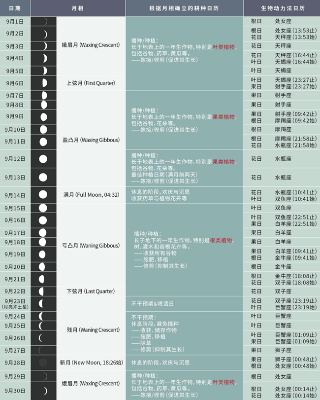 雖然這套生物動力歷法在外人看來似乎有些“玄乎”,但也有其理論依據(jù)。該體系認為,像海水的潮汐現(xiàn)象一樣,植物中的液體也會隨著月亮對地球引力變化而轉(zhuǎn)移至不同部位。比如月圓時植物中的液體會向冠部集中,適合種植、嫁接、采收,月缺時液體會向根部集中,更適合除草、翻土、修枝、施肥。
