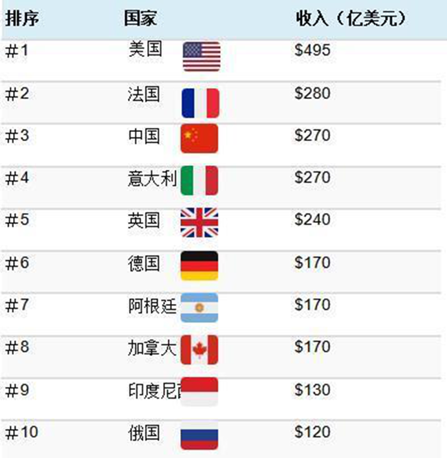 各個國家的葡萄酒銷售收入情況,單位是:10億美元。美國第一、中國第三。