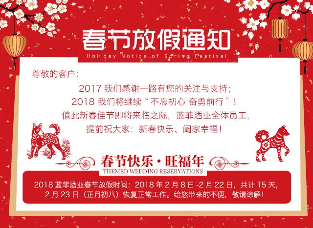 新年的鐘聲即將敲響,根據(jù)國(guó)家春節(jié)假期通知及藍(lán)菲公司的實(shí)際情況,確定于2018年2月9日-2月22日,共14天,為藍(lán)菲酒業(yè)春節(jié)假期,于2018年2月23日(正月初八)正式上班,請(qǐng)好朋友們悉知。同時(shí)在此提前恭祝,新春快樂(lè)!